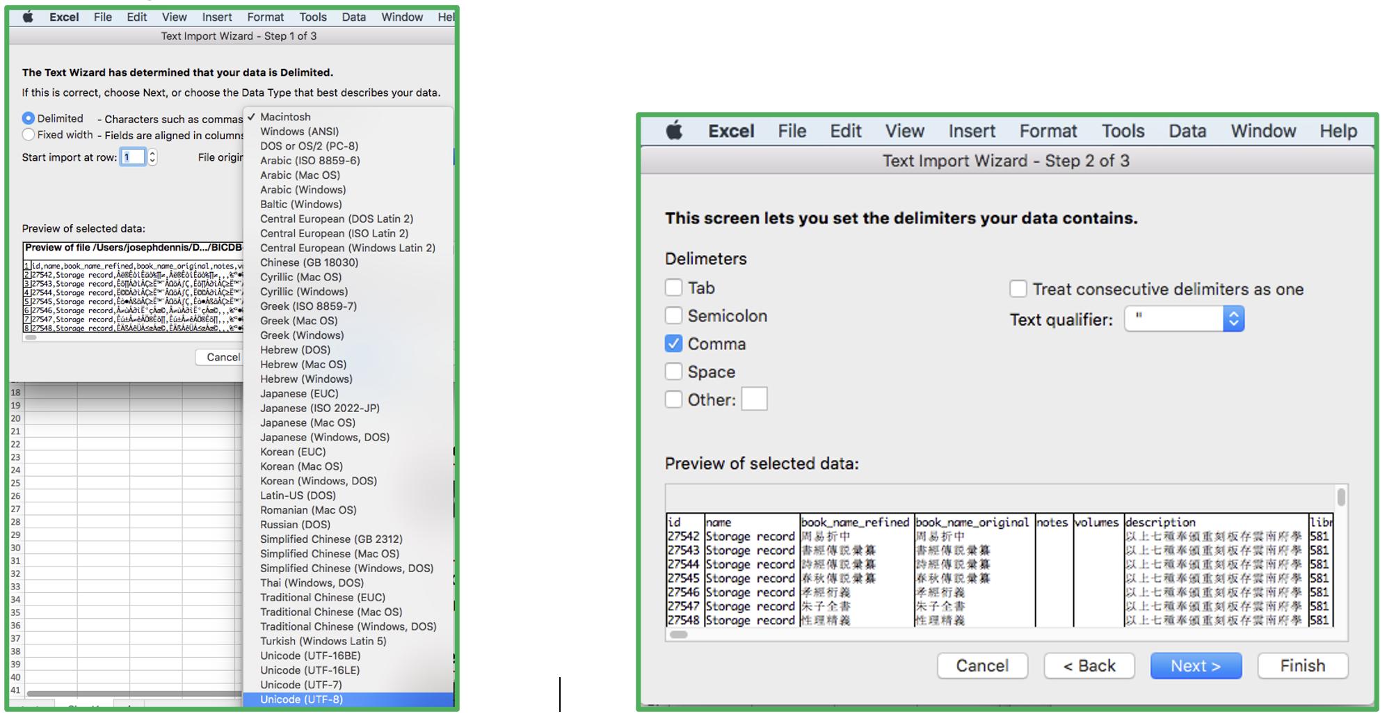 A: There are various ways: Chinese should appear correctly when imported into Google Sheets. Importing the data into Excel may require specifying Unicode (UTF-8) under the “File Origin” dropdown menu in the “Text Import Wizard” and then switching the delimiter to “Commas.” See the figures below:
